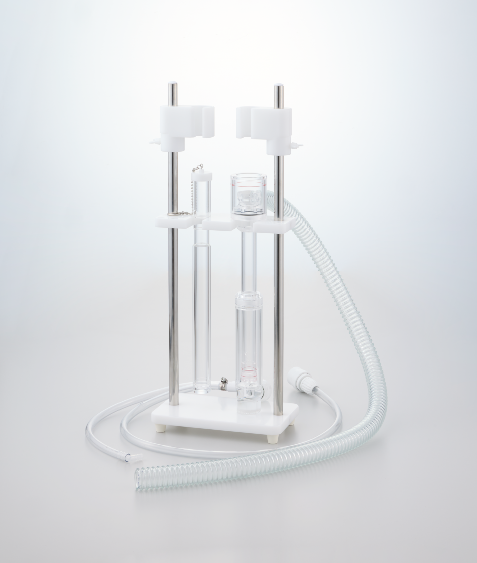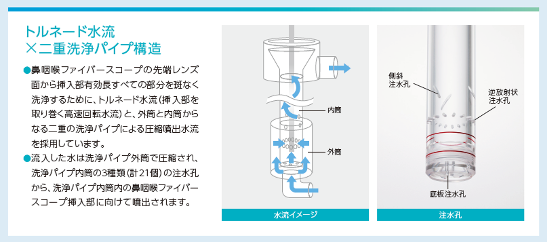 上水道の水流、水圧のみで動作し、動力を必要としない鼻咽喉ファイバースコープ(ビデオスコープを含む)専用の洗浄器です。